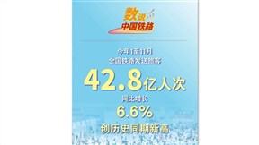 國鐵集團微信披露,今年1至11月,全國鐵路發送旅客42.8億人次,按年增長6.6%,創歷史同期新高。期間,全國鐵路日均安排開行客運列車11,258列,按年增7.1%。廣深港高鐵、中老鐵路分別發送跨境旅客2,894萬、24.4萬人次。(hc/u)~阿思達克財經新聞網址: www.aastocks.com