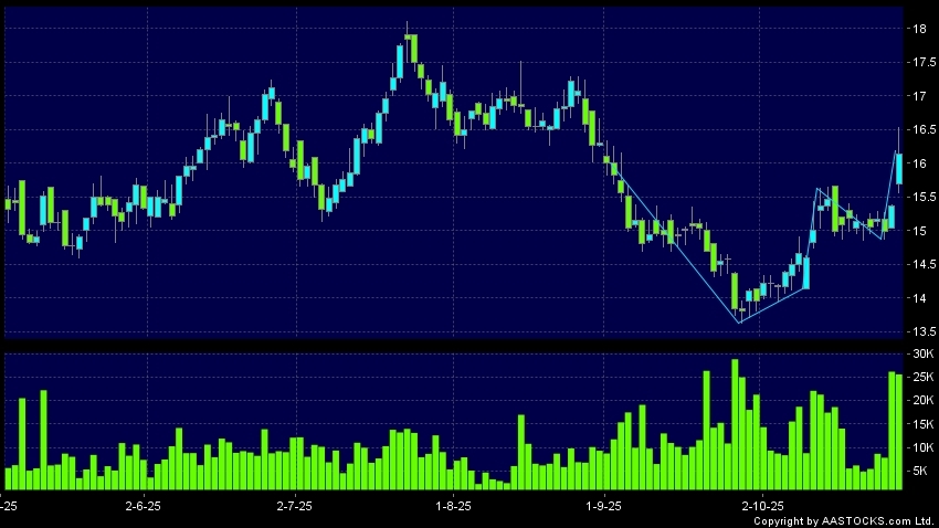 濰柴動力(02338.HK)  +0.690 (+4.492%)    沽空 $9.84千萬; 比率 17.077%   呈現杯柄形向上突破。現價報16.120,上升4.948%,成交量2.58千萬股,成交額4.18億。