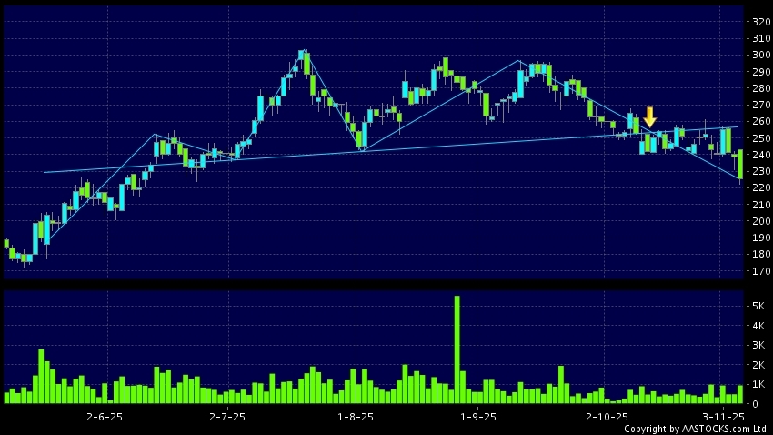 免責聲明:以上金融市場數據、報價、圖表 及/或各種技術分析指標乃根據公開資料分析和演釋自動生成的,僅作參考使用。此類自動生成的內容並不代表AASTOCKS.com Limited的立場。AASTOCKS.com Limited並不保證其準確性、完整性、實時性或者正確性。閣下應諮詢獨立專業意見,以核實定價資料或獲取更詳細的市場信息及須為所有跟隨此類自動生成的內容執行的交易或使用該內容負責。